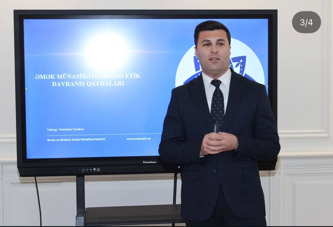 Təlimdə Milli Observatoriyanın tərəfdaş qurumlarından olan DOST İnklüziv İnkişaf Yaradıcılıq Mərkəzinin şöbə müdiri Tamerlan Turabov spiker qismində çıxış edərək etik davranışın əsas prinsipləri, ictimai və iş mühitində peşəkar kommunikasiya qaydaları, qarşılıqlı hörmət mədəniyyəti, həmçinin etik pozuntuların sosial nəticələri barədə iştirakçılara ətraflı məlumat verib.